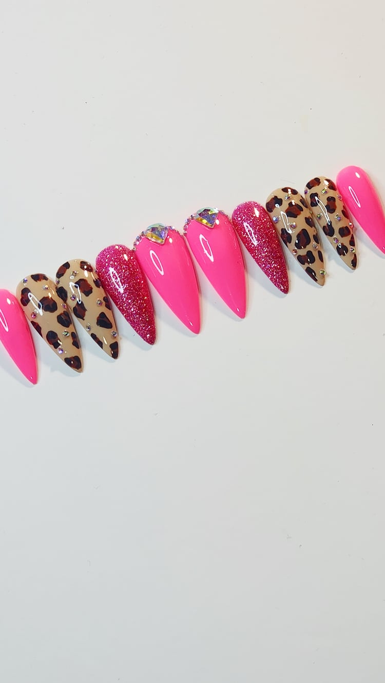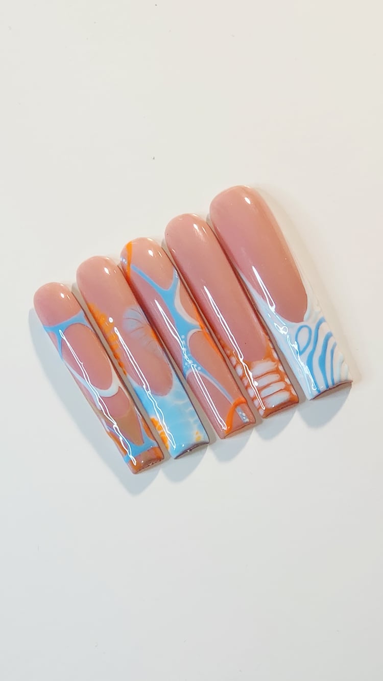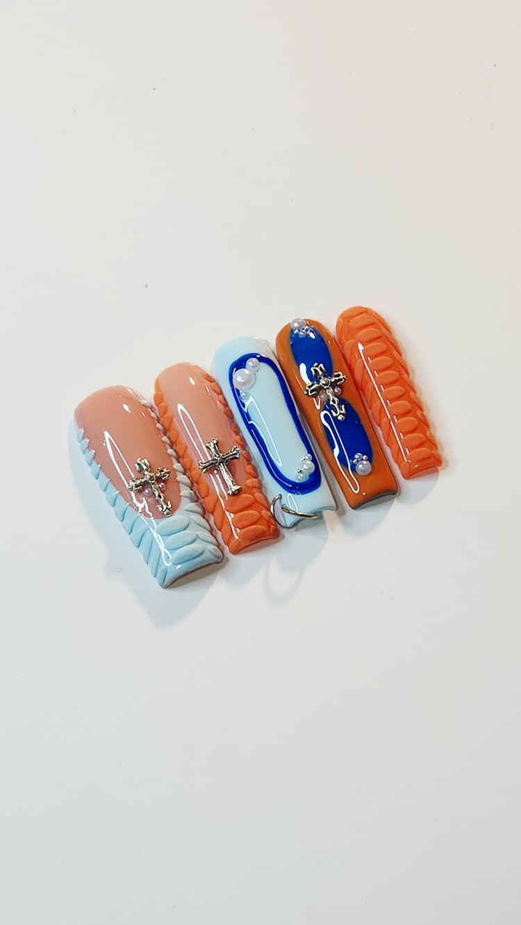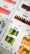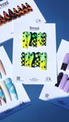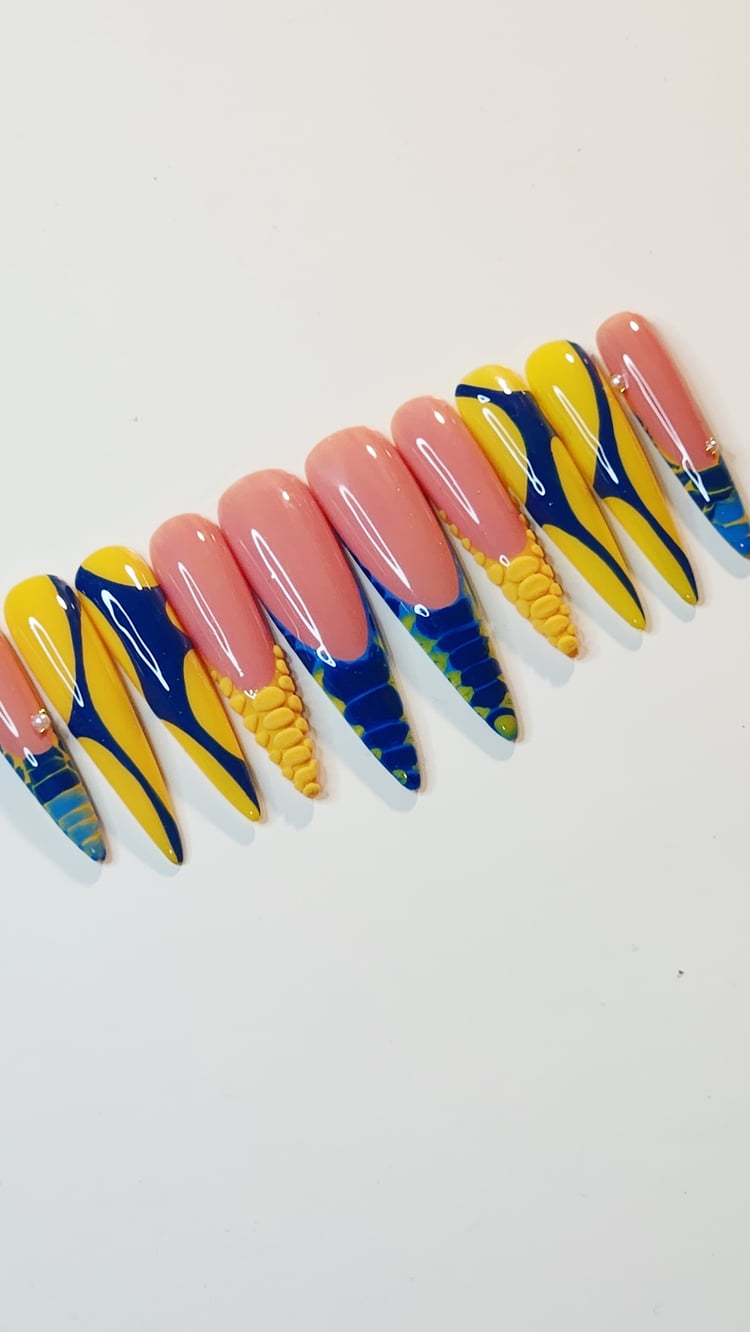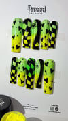 Neon pigments are at it again. Step up your green game this summer with this handmade neon lemon & lime ombre racer press-on set. Hand-drawn cute hearts and checkered patterns elevate this set from plain to powerful. Available to purchase in shorter or longer square tips.